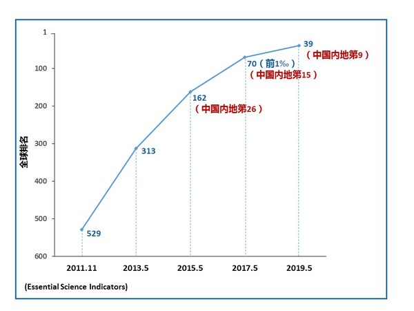 2017年5月,材料科学、化学同时进入ESI全球排名前千分之一。2019年5月,材料科学已上升至ESI全球第39,中国内地第9。2018年11月,材料科学在U. S. News学科排名中位列全球第19,国内第7。