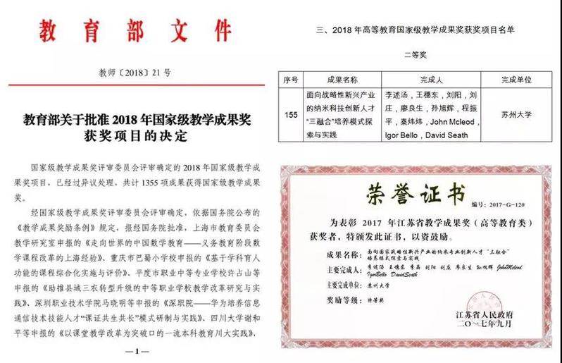构建的教科融合、学科融合、国际融合的纳米专业创新人才“三融合”培养模式荣获2018年国家级教学成果奖二等奖、2017年江苏省教学成果特等奖。