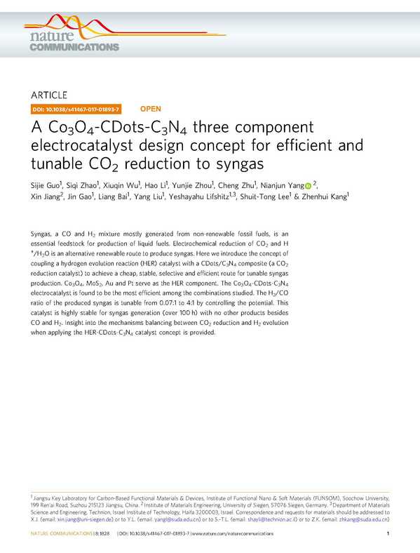 近日,《Nature Communications》杂志在线发表了康振辉教授课题组与德国锡根大学Xin Jiang教授和以色列理工学院Yeshayahu Lifshitz教授合作的突破性研究成果:四氧化三钴-碳点-氮化碳(Co3O4-CDots-C3N4)三元复合催化剂用于催化二氧化碳还原和析氢反应制备合成气,该研究解决了制备合成气的瓶颈。