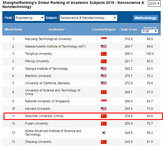 6月26日,2019“软科世界一流学科排名”(Shanghai Ranking's Global Ranking of Academic Subjects)正式发布。苏州大学“纳米科学与技术”在全球排名中位列第11位(相比去年上升了8位),在中国高校排名中位列第4位(相比去年上升了1位),进步明显。国内高校排名前3位的依次是:清华大学、北京大学、中国科学技术大学。