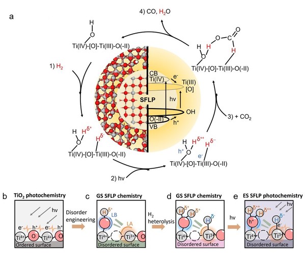 Fig. 1 SFLPs, confined to the surface of the amorphous shell of the c-TiO2@a-TiO2-x(OH)y heterostructure, facilitate record photocatalysis CO2 performance.