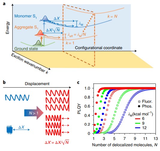 Recently, the research group of Prof. Liang-sheng Liao, collaborated with Prof. Yun Chi (City University of Hong Kong) and Pi-Tai Chou (National Taiwan University), reported a unified semi-empirical approach by incorporating exciton theory into the formula for the energy gap law. They demonstrated that partitioning the reorganization energy by increasing the exciton delocalization length significantly enhanced the PLQY in the NIR region, thereby overcoming the luminescent boundary set by the energy gap law. A proof of concept was provided experimentally by the strategic design and syntheses of a new series of Pt(‖) complexes, which, on assembling, produced intense NIR emission maximized at 866–960 nm with an unprecedented PLQY of 5–12% and superior performance in NIR OLEDs.