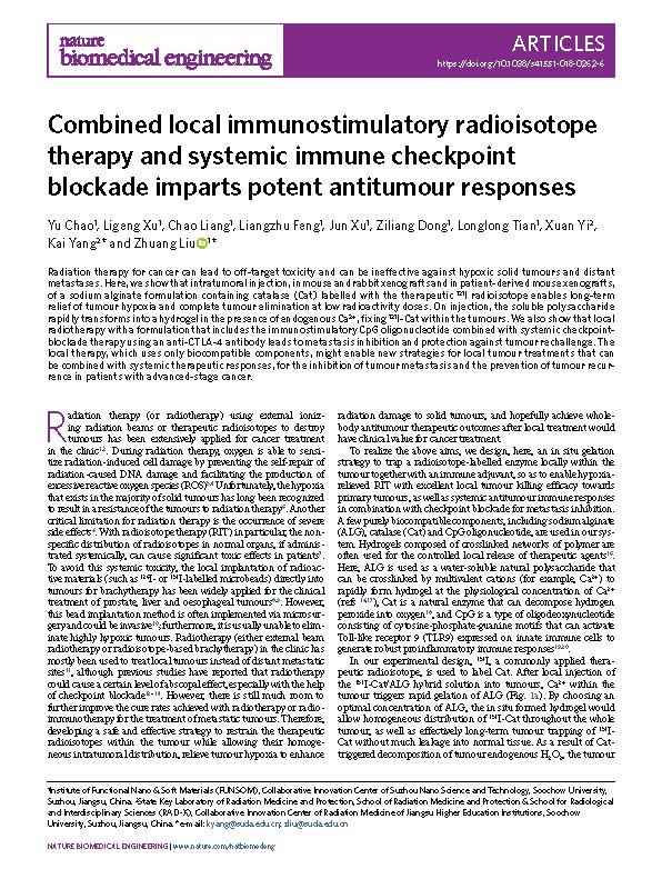 Prof. Zhuang Liu’s research paper ‘Combined local immunostimulatory radioisotope therapy and systemic immune checkpoint blockade imparts potent antitumour responses’ was published in Nature Biomedical Engineering (Nat. Biomed. Eng. 2018, DOI: 10.1038/s41551-018-0262-6). Associate Prof. Kai Yang from School of Radiation Medicine and Protection & School for Radiological and Interdisciplinary Sciences (RAD-X), Soochow University, as one of the corresponding authors, also contributed to this work.
