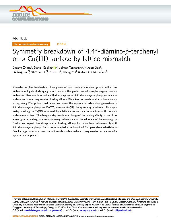 Prof. Lifeng Chi’s research paper ‘Symmetry breakdown of 4,4″-diamino-p-terphenyl on a Cu(111) surface by lattice mismatch’ was published in Nature Communications (Nat. Commun, 2018, 9, 3277). Prof. Daniel Ebeling from Justus-Liebig University, Germany, and Dr. Shixuan Du from Institute of Physics & University of Chinese Academy of Sciences, Chinese Academy of Sciences, as corresponding authors, also contributed to this work.