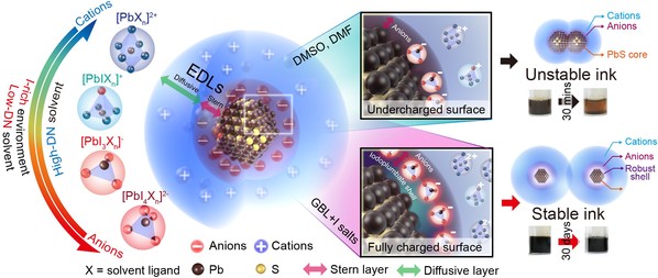 However, the transfer of these emerging CQD inks into the industry is currently hindered by the lack of scalable and cost-effective inks, placing stringent requisites on ink stability and simplified processing. The ink stability is not only decisive for industrial mass production but also governs nano-morphology and microstructure formation in the CQD assembly.The ideal CQD semiconductor for high-performance electronics is characterized by fast charge transport at minimum energy losses. This requires a fine-tuned surface matrix with nanoscale morphology control and macroscopic film uniformity.Unstable CQD inks result in films that (i) suffer from morphological inhomogeneity, including serious aggregation and even inter-CQD epitaxial fusion, and (ii) show significant energetic disorder and electro-optically active traps. Both facts have been inhibiting the printing and scaling-up of efficient CQD electronics, which has been particularly expressed in the field of CQD photovoltaics.