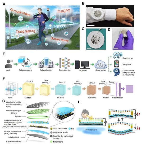 To address these challenges, Prof.Baoquan Sun’s team at the Institute of Functional Nano & Soft Materials (FUNSOM), Soochow University, together with collaborators, has developed a deep learning–empowered acoustic textile (A-Textile). Based on the principle of triboelectric electrostatic generation and a multilayer composite architecture, the A-Textile enables self-powered, fabric-level voice perception and direct interaction with generative AI (ChatGPT), providing a new pathway for intelligent clothing. By incorporating three-dimensional SnS₂ nanoflower structures into silicone rubber to enhance charge capture and transport, and introducing a carbonized-fabric/SnS₂ charge-storage layer, the system achieves high-sensitivity, cavity-free acoustic vibration detection. The A-Textile delivers an output voltage of 21 V, a sensitivity of 1.2 V Pa⁻1, a frequency resolution of 1 Hz, and a signal-to-noise ratio of 59.3 dB, covering the 80–900 Hz speech range while maintaining stable performance under repeated cycling, humidity, and bending. By integrating a two-dimensional convolutional neural network (2D CNN), the system can accurately recognize voice commands, achieving 93.5% and 97.5% recognition accuracies in smart-home control and voice navigation applications, respectively. Moreover, it enables real-time voice-to-AI interaction with ChatGPT for spoken queries and task execution, demonstrating the potential of wearable generative-AI terminals. This work realizes a deep fusion of acoustic sensing materials, flexible electronics, and artificial intelligence algorithms, offering a new approach for intelligent textiles and human–machine interactive systems. The study was published in Science Advances (DOI: 10.1126/sciadv.adx3348). Dr. Beibei Shao, Associate Research Fellow at FUNSOM, is the first author of this paper.
