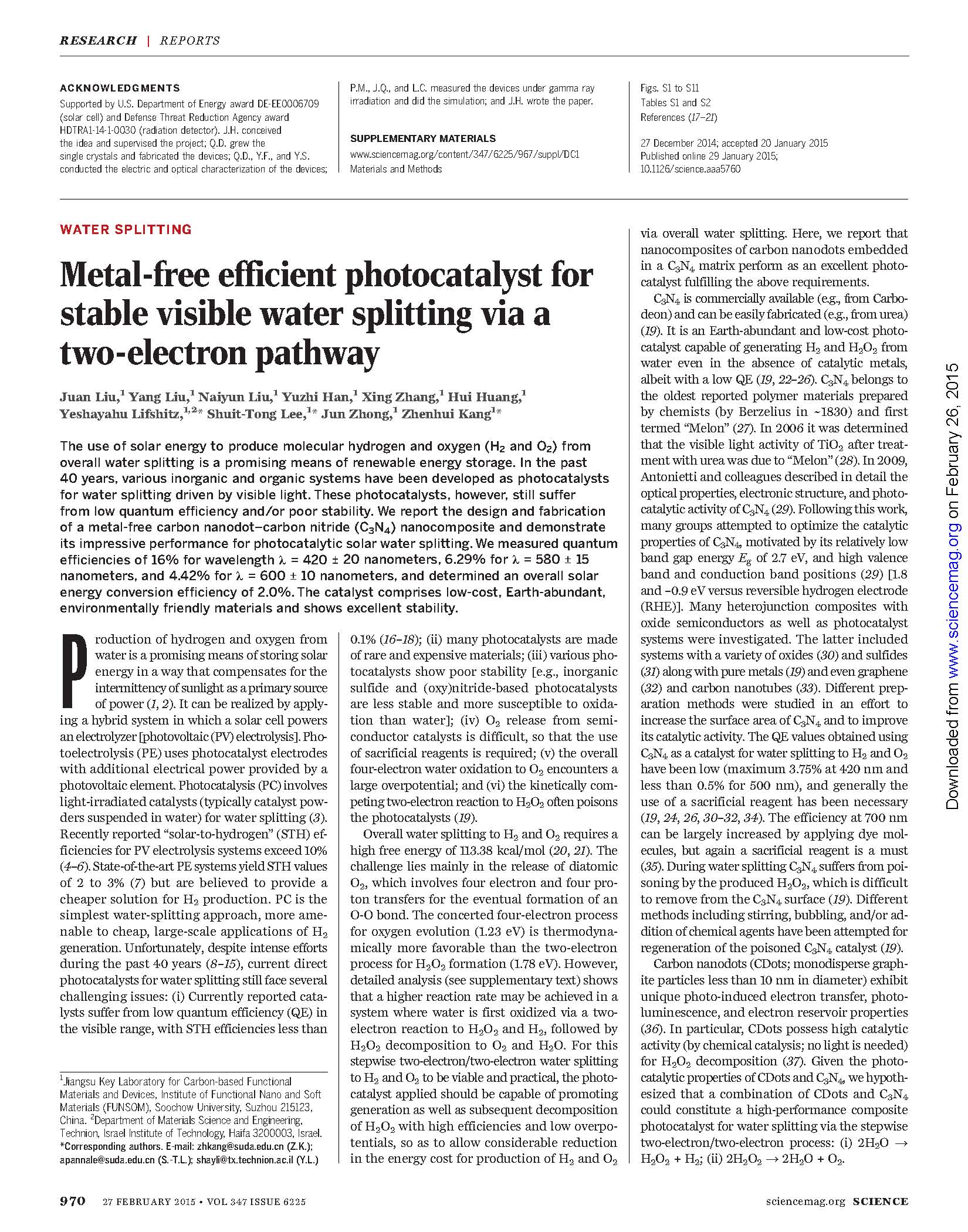 Prof. Zhen-Hui Kang, Prof. Shuit-Tong Lee and Prof. Yeshayahu Lifshitz’s research paper ‘Metal-Free Efficient Photocatalyst for Stable Visible Water Splitting via a Two-Electron Pathway’ has been published in Science (Science, 2015: Vol. 347 (no. 6225), 970-974).