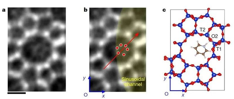 Recently, Prof. Boyuan Shen, in cooperation with Prof. Fei Wei and Dr. Xiao Chen of Tsinghua University, applies the iDPC-STEM and in-situ imaging technology into the direct observation of the adsorption/desorption behaviors and atomic configurations of pyridine and thiophene molecules in zeolite ZSM-5, breaking through the technical bottleneck that it is difficult for a single organic molecule to be imaged at the atomic level under electron microscope. The interaction mechanism between small molecules, such as pyridines and thiophenes, and acid sites of zeolites was really analyzed at the atomic level. The atomic coordinates obtained from intensity profile analysis are compared with the simulation results to figure out a configuration closest to the imaging results by using the least square fitting, so that the most probable position of acid site can be pointed out with atomic resolution. This work provides a general strategy for directly observing the configurations and interactions of these molecules in static images and in-situ experiments, and further extends the applications of ultra-high-resolution electron microscopy to the real-space study of a variety of single molecule behaviors. Relevant results were published online in Nature on July 13, 2022 (Nature, volume 607, pages 703–707 (2022)). Prof. Boyuan Shen is the first author of this paper.