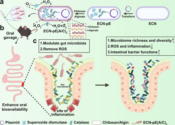Recently, Prof. Zhuang Liu and Prof. Qian Chen of our Institute developed an orally programmable probiotic for enhanced IBD treatment following scavenging of reactive oxygen species at the site of intestinal inflammation. Here, Escherichia coli Nissle 1917 (ECN), a kind of oral probiotic, was genetically engineered to overexpress catalase and superoxide dismutase (ECN-pE) to scavenge reactive oxygen species, therefore improving the treatment of intestinal inflammation. To improve the bioavailability of ECN-pE in the gastrointestinal tract, chitosan and sodium alginate, effective biofilms, were used to coat ECN-pE via a layer-by-layer electrostatic self-assembly strategy. In a mouse IBD model induced by different chemical drugs, chitosan/sodium alginate coating ECN-pE (ECN-pE(C/A)2) effectively relieved inflammation and repaired epithelial barriers in the colon. Such engineered EcN-pE(C/A)2 could also regulate the intestinal microbial communities and improve the abundance of Lachnospiraceae_NK4A136 and Odoribacter in the intestinal flora, which are important microbes to maintain intestinal homeostasis. Thus, this study lays a foundation for the development of living therapeutic proteins using probiotics to treat intestinal-related diseases. The relevant results were published online June 14, 2022 in Nature Communications (Nat. Commun. 13, 3432 (2022)). PhD Jun Zhou is the first author of this paper.