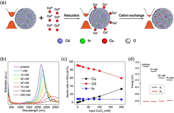 Recently, Prof. Wanli Ma from FUNSOM, Prof. Xingchen Ye from Indiana University developed cation-exchange reactions to introduce p-type dopants (Cu+, Ag+, etc.) into n type metal-oxide nanocrystals, producing programmable LSPR redshifts due to dopant compensation. Cation-exchange transformations add a new dimension to the design of plasmonic nanocrystals, allowing preformed nanocrystals to be used as templates to create compositionally diverse nanocrystals with well-defined LSPR characteristics. The ability to tailor the doping profile postsynthetically opens the door to a multitude of opportunities to deepen our understanding of the relationship between local structure and LSPR properties. Their work has been published in Nature Communications (Nat. Commun., 2019, 10, 1394), titled as “Tuning infrared plasmon resonances in doped metal-oxide nanocrystals through cation-exchange reactions”.