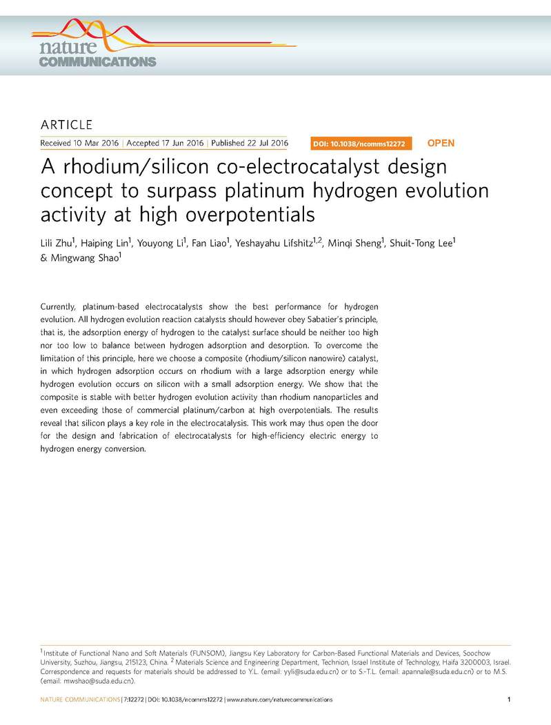 Prof. Mingwang Shao and Prof. Youyong Li’s research paper ‘A Rhodium/Silicon Co-Electrocatalyst Design Concept to Surpass Platinum Hydrogen Evolution activity at High Overpotentials’ was published in Nature Communications (Nature Communications, 2016, 7, 12272, DOI: 10.1038/ncomms12272).