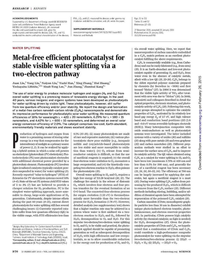 Prof. Zhen-Hui Kang, Prof. Shuit-Tong Lee and Prof. Yeshayahu Lifshitz’s research paper ‘Metal-Free Efficient Photocatalyst for Stable Visible Water Splitting via a Two-Electron Pathway’ has been published in Science (Science, 2015: Vol. 347 (no. 6225), 970-974).