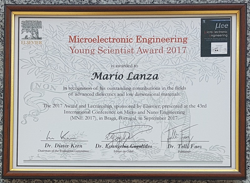Recently, Microelectronic Engineering Journal from Elsevier announced the winner for 2017 Young Investigator Award and Lecturership. As the winner, Prof. Mario Lanza, was awarded and gave a invited lecture at the MNE 2017 Conference in September 22, 2017 in Braga, Portugal (www.mne2017.org). The award is given for his outstanding achievements in the areas of advanced dielectrics and low dimensional materials.