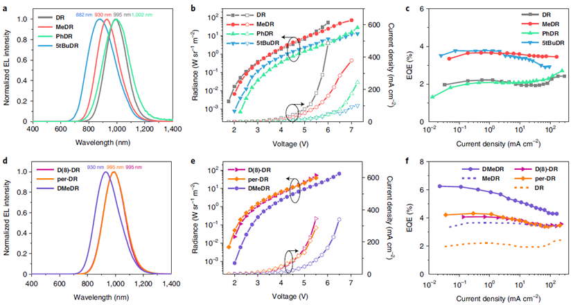 NIR OLED, especially devices with emission wavelength reaching or exceeding 1000 nm (i.e. within the NIR(II) region) play important roles in phototherapy, bioimaging and wearable healthcare products (such as oximeters and phototherapeutic patches). However, hampered by the energy gap law, when the emission gap shifts to the deep red and near-infrared regions, the fast non-radiative deactivation process will greatly reduce the luminescence intensity, resulting in significant efficiency quenching, limiting the development of NIR OLEDs.