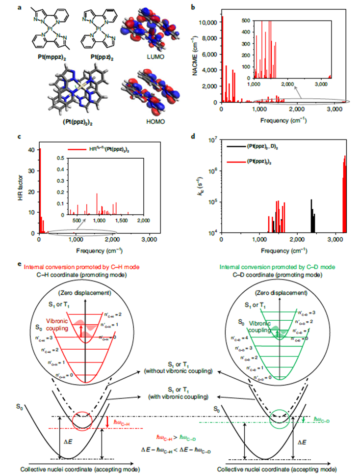 To address this problem, recently, Prof. Liang-Sheng Liao from the Institute of Functional Nano and Soft Materials of Soochow University, Prof. Wen-Yi Hung from National Taiwan Ocean University, Prof. Yun Chi from City University of Hong Kong, and Prof. Pi-Tai Chou from National Taiwan University have jointly carried out a series of studies. Based on their previous collaborative research output (Nat. Photonics 2020, 14, 570-577), they further investigated the contribution of each coupled vibrational mode to non-radiative transitions in molecules. Two strategies were proposed to achieve highly efficient NIR emission through molecular packing to extend exciton delocalization and deuterium substitution to reduce molecular high-frequency vibration. To this end, the collaborative team fully utilized the synergy of self-assembled exciton delocalization to reduce the reorganization energy and elimination of C-H-associated high-frequency vibrations to suppress the Franck-Condon overlap, confirming the phosphorescent emitters based on Pt(II) complexes can break through the limitation of the energy gap law in the NIR(II) region. Ultimately, they used a series of novel Pt(II) complexes based on fused aromatics to extend π-conjugation and guarantees the planarity and rigidity of the molecule simultaneously, thereby promotes exciton delocalization. NIR OLEDs based on these novel Pt(II) complexes exhibit excellent device performance beyond 930 nm, where the per-DR-based device has an emission peak approximately at 1000 nm with a maximum external quantum efficiency of 4.31%. At an operating voltage of only 4.5 V, it exhibits a bright radiance of over 10 W sr-1 m-2. This research opens up a new avenue for the development and application of high-performance OLEDs in the NIR(II) region. The related results have been published on Nature Photonics (DOI: 10.1038/s41566-022-01079-8). Xue-Qi Wang, a master student from Prof. Liang-Sheng Liao's group, is one of the co-first authors of this paper.