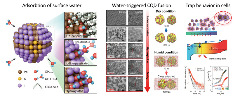 We cooperated with two scientists in FUNSOM, Prof. Steffen Duhm, and Prof. Liang Zhang. The XPS and XAS results provide experimental evidences for the water adsorption on CQD surfaces. We surprisingly found that under humid ambient with gentle heating, the CQD significantly fused with each other. This randomly fused CQD with large sizes shows less CQD confinement and thus small bandgaps, which lead to optically sensitive traps. Eventually, Prof. Lu Wang and Prof. Shiyun Xiong in FUNSOM performed critical DFT calculations and molecular dynamics to depict the fusion mechanism.
