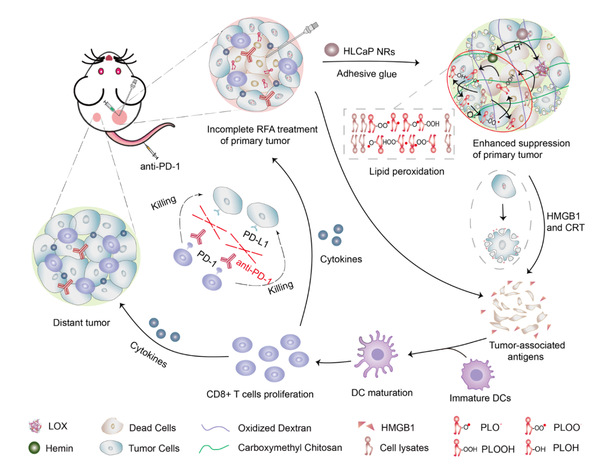 Recently, the research group of Prof. Zhuang Liu, collaborated with Assoc. Prof. Liangzhu Feng develops a CaCO3-assisted double emulsion method to encapsulate lipoxidase and hemin with PLGA copolymers. The obtained HLCaP nanoreactors (NRs) show pH-dependent catalytic capacity, with lipoxidase to induce continuous production of lipid hydroperoxides using cancer cell debris as the fuel, and hemin to subsequently trigger generation of abundant cytotoxic reactive oxygen species (ROS) from these lipid hydroperoxides. Upon being fixed inside the residual tumors post RFA, such HLCaP NRs could produce lipid ROS from tumor debris to trigger ferroptosis, and exhibit superior suppression effect on those residual tumors growing on both mice and rabbits. Moreover, ferroptosis triggered by HLCaP NRs post RFA could prime anti-tumor immunity to effectively suppress the growth of both residual and metastatic tumors, especially in combination with anti-PD-1 immunotherapy. This work highlights an innovative tumor debris fueled anti-tumor strategy by utilizing the tumor-killing HLCaP NRs prepared via our developed CaCO3-assisted double emulsion process. Such HLCaP NRs with the capability in effectively inducing lipid peroxidation from tumor debris could not only enhance the therapeutic outcome of RFA, but also act as an immunogenic nanomedicine to enable the synergistic combination of RFA with ICB immunotherapy.