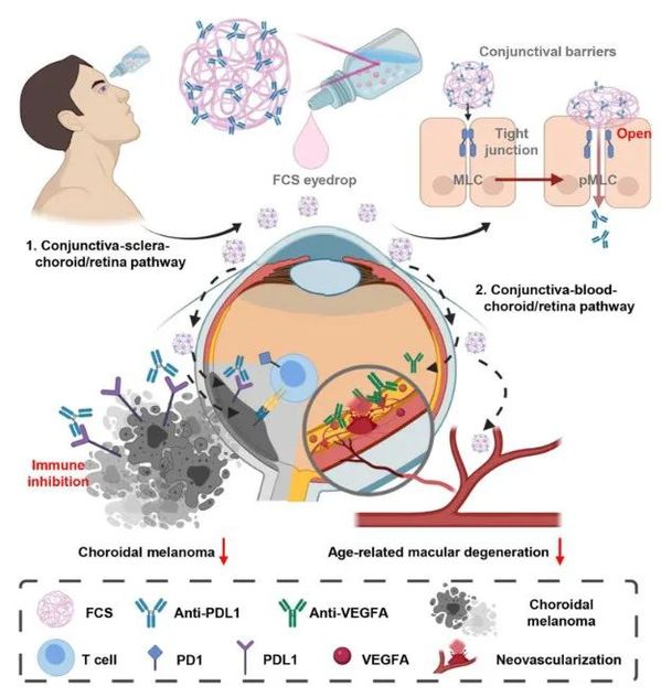 Fundus diseases have been widely concerned due to their increasing incidence, sensory impairment, limited treatment and high postoperative risk.Nowadays, therapeutic antibodies have been widely used in intravitreal injection to treat fundus diseases and have achieved certain clinical efficacy.However, intravascular injection can cause discomfort to patients, and there may be risks of intraocular infection, intraocular bleeding, and retinal detachment.Therefore, there is an urgent need to develop an efficient local ophthalmic drug delivery system for non-invasive delivery of therapeutic macromolecule drugs to fundus patients. However, the complex ocular barrier structure often limits the research and development of most preparations.
