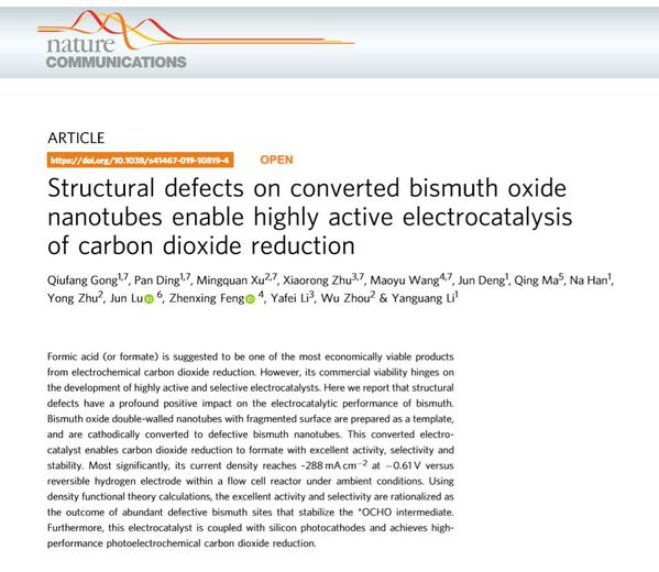 Prof. Yanguang Li’s research paper ‘Structural defects on converted bismuth oxide nanotubes enable highly active electrocatalysis of carbon dioxide reduction’ was published in Nature Communications (Nature Commun. 2019, 10, 2807). Prof. Yafei Li from Nanjing Normal University, Prof. Wu Zhou from University of Chinese Academy of Sciences, Prof. Zhenxing Feng from Oregon State University (USA) and Prof. Jun Lu from Argonne National Laboratory (USA), as corresponding authors, also contributed to this work.